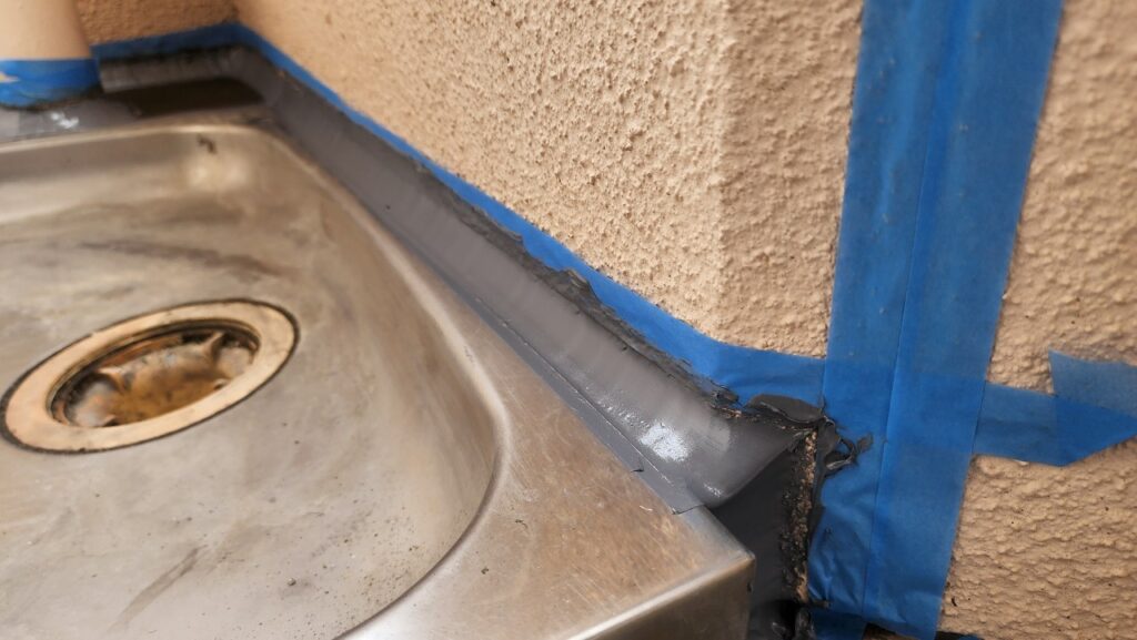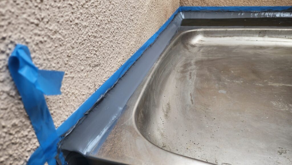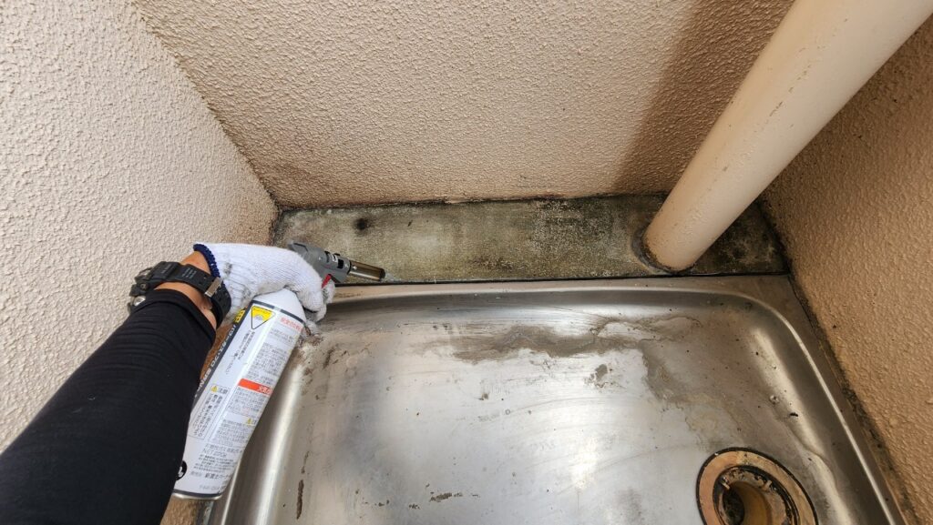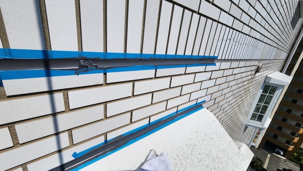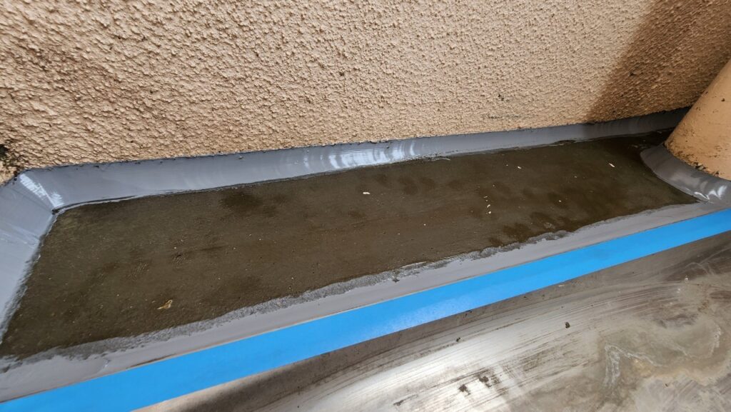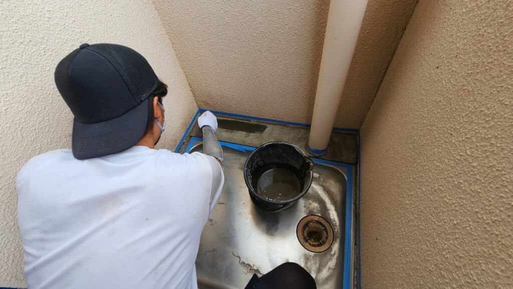 大阪市 5階建てマンション 漏水修繕工事 バルコニー1 2025年12月10日 洗濯機移動 トーチ使用 プライマー塗布 プライマー塗布完了 シーリング打設 シーリング打設 シーリング打設 シーリング打設完了 ウレタン防水1回目 ウレタン防水2回目 トップコート塗布 トップコート塗布 トップコート塗布