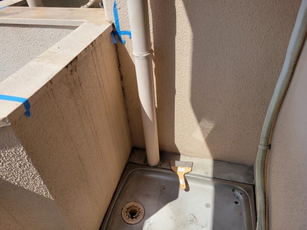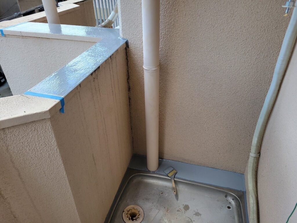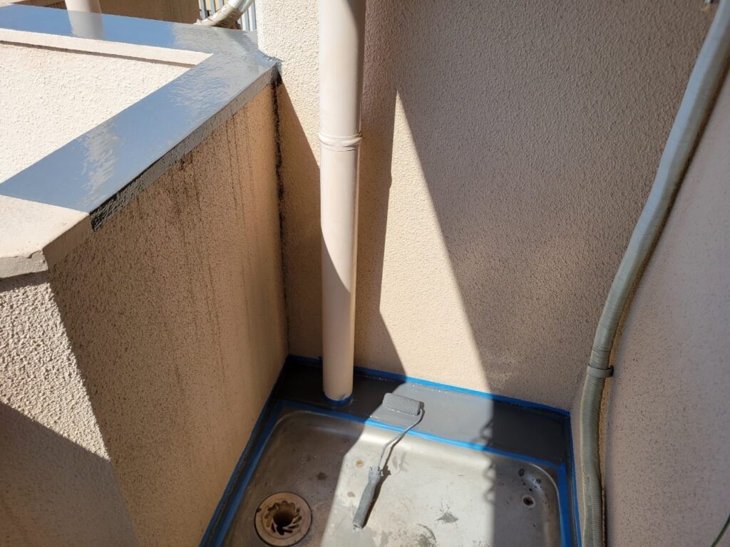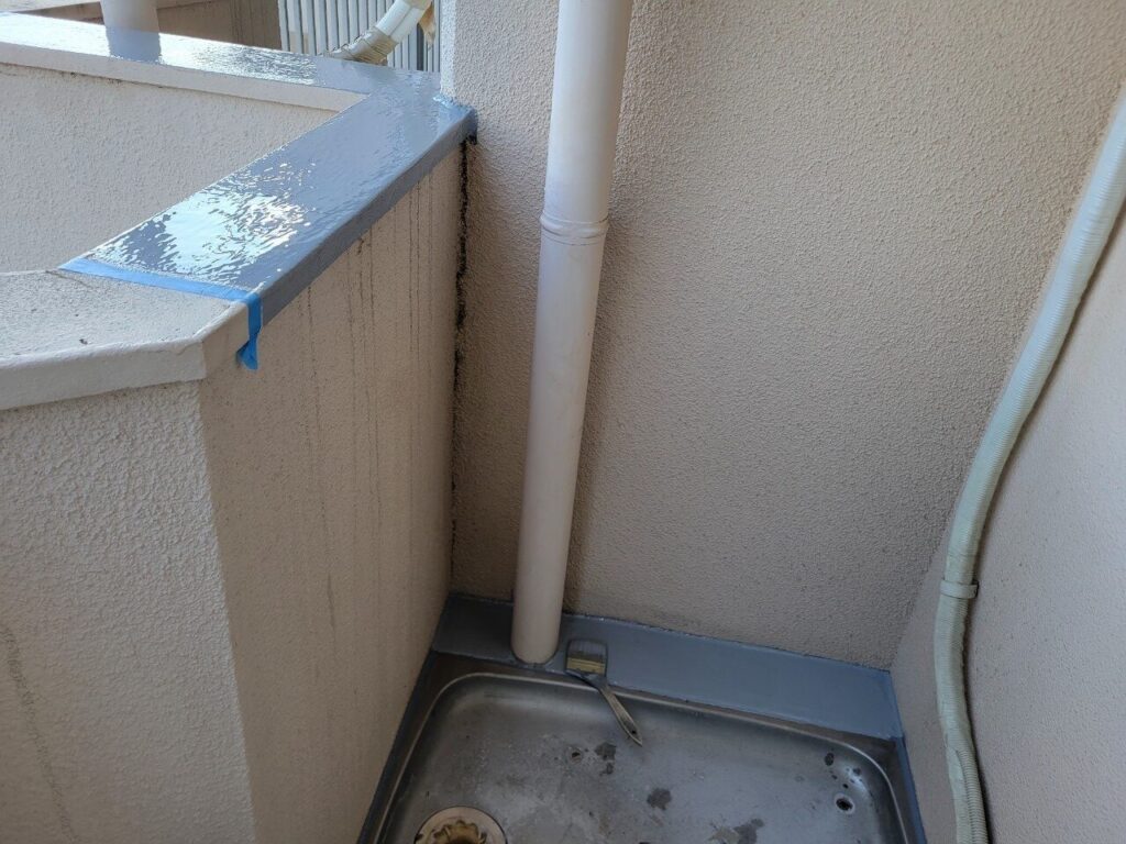 大阪市 5階建てマンション 漏水修繕工事 ベランダ1 2025年12月16日 施工前 ケレン・清掃 シーリング打設 プライマー塗布 ウレタン1回目 ウレタン2回目 養生 シーリング打設 トップコート塗布 完了