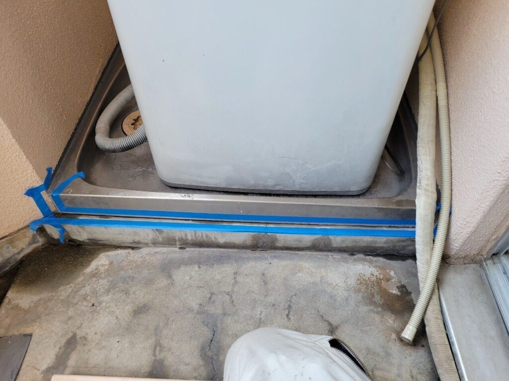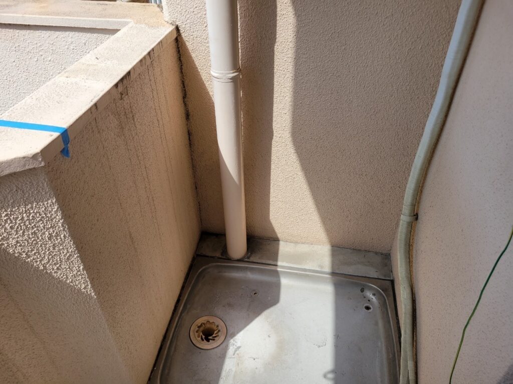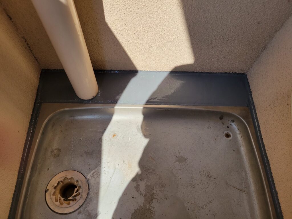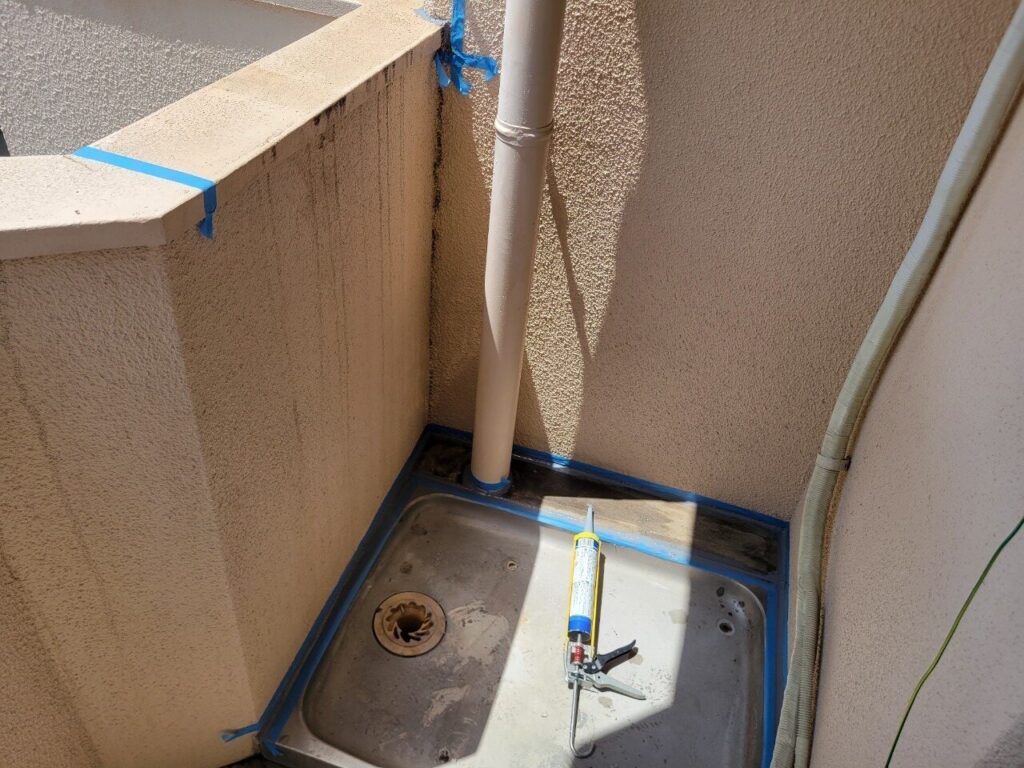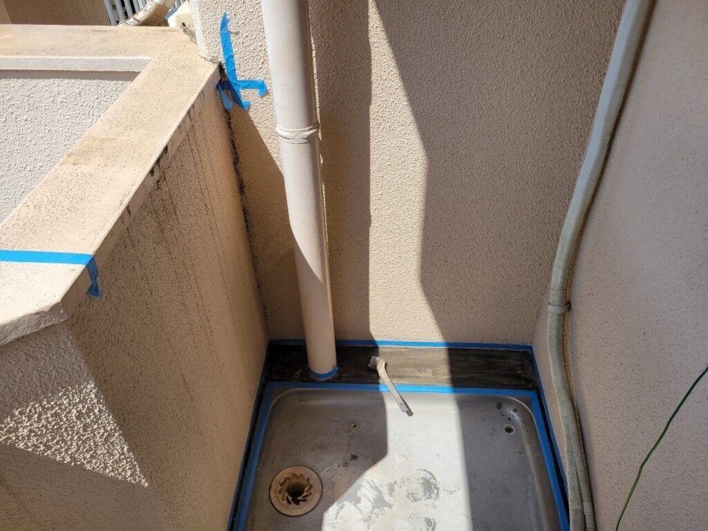 大阪市 5階建てマンション 漏水修繕工事 ベランダ1 2025年12月16日 施工前 ケレン・清掃 シーリング打設 プライマー塗布 ウレタン1回目 ウレタン2回目 養生 シーリング打設 トップコート塗布 完了