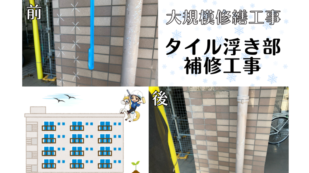豊中市 4階建てマンション 大規模修繕工事 タイル浮き部補修工事