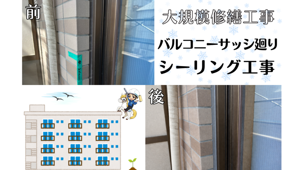 豊中市 4階建てマンション 大規模修繕工事 バルコニーサッシ廻り シーリング工事